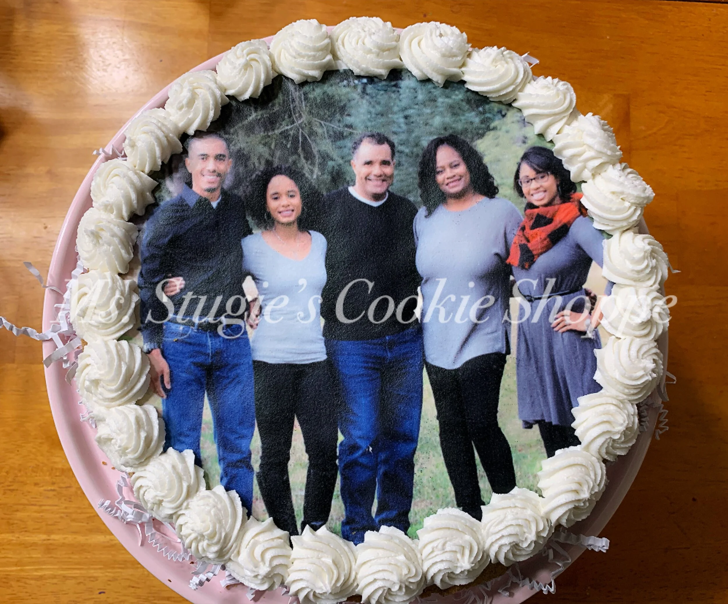 8 inch Chocolate chip cookie cake with buttercream frosting and an edible image.